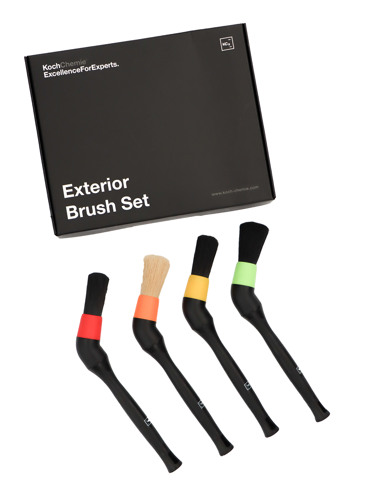 The coordinated brush set is suitable for preparing the vehicle exterior. The set consists of four brushes with an angle that can be unscrewed to reach even hard-to-reach places. The different bristles make it easy to clean different areas of outdoor use. The colour coding of the four brushes makes it easy to differentiate them according to the area of application. The acid-resistant red brush is ideal for cleaning the rims. The orange brush is the right choice for rough work on plastic parts, such as cleaning the radiator grille or sills. Glass surfaces and rubber, such as side mirrors or seals, can be effectively cleaned with the yellow brush. With particularly fine work on sensitive paint surfaces, such as chrome or piano lacquer, our green brush works with the necessary caution due to its particularly fine bristles. External cleaning is easy especially in combination with our products.